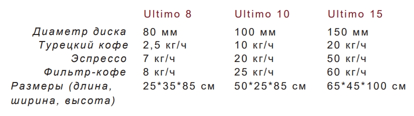 Кофемолки Ultimo предназначены для приготовления турецкого, а также эспрессо и других видов кофе. Кофемолки серии Ultimo оснащены высокопроизводительными стальными дисками. Они могут работать 8 часов в день в периодическом режиме.